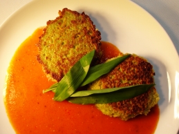 Die hübschen, grün-goldenen Hirseküchlein in der März-Ausgabe 2007 der Saisonküche (dem Kochheft des Schweizer Grossverteilers Migros) haben Frau lamiacucina direkt angelacht. Eben aus dem Wald mit einem grossen Bund Bärlauch zurückgekommen, mussten wird das Mittagessen nicht mehr diskutieren. Das Kochheft präsentiert die Küchlein würg-trocken. Da wir uns den Körnerfressern nicht zugehörig fühlen, haben wir dazu eine wunderbare Paprikasauce gemacht. (Das Rezept stammt aus dem Saucen-Kochkurs von Lucas Rosenblatt). Die Sauce ist so gut, dass selbst eingefleischte(!) Vegetarier hemmungslos zugreifen würden. Das macht der gute Kalbsfond. Die Küchlein sind schmackhaft, das hätte ich einem „Hirsebratling“ wirklich nicht zugetraut.