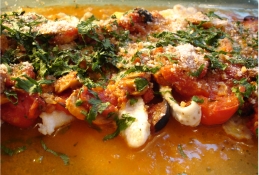 (3) Eine beschichtete Pfanne mit 2 Elf. Olivenöl erwärmen. Die Solefilets hineinlegen, nach einer Minute wenden und nochmals ganz kurz weiterbraten. Dann die Filets in die Gratinform legen. Salzen, pfeffern.