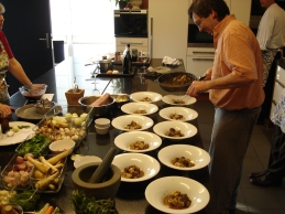 Mein Bericht ist kurz: Noch nie habe ich an einem halben Tag soviel gelernt wie hier. Lucas gibt sein Wissen offen weiter. Zubereitet wurden alle oben genannten Grundfonds, dazu wurden einige Saucengerichte gekocht: Gratin von Meeresfrüchten, Gulasch von der Rindswade, Pouletfricassé mit weissem Portwein und frischen Morcheln sowie ein Stroganoff vom Lammfilet. Die zubereiteten Fonds durften glasweise nach Hause getragen werden.
