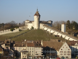 Eine prächtige Festung, der Munot. Wahrzeichen von Schaffhausen. Erbaut zwischen 1563 und 1585 im Stil von Albrecht Dürers Rondellbefestigung. Militärisch wurde sie nur einmal genutzt, von den Franzosen, 1799 während des Rückzugs vor den Österreichern. Der Abhang zwischen den aus-ladenden Mauern ist seit rund 100 Jahren mit Reben bepflanzt. Der Munotrebberg gehört der Stadt Schaffhausen.