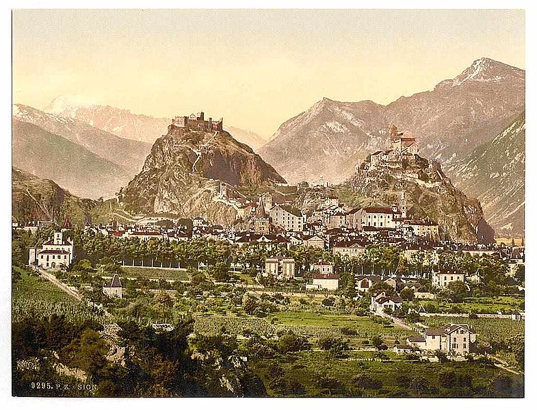 Genauso wie auf der alten Ansichtskarte wird das Stadtbild heute noch beherrscht von den zwei üppig aus dem Hang spriessenden Felsen Valère und Tourbillon. Valère, der südlich, rechts im Bild, gelegene Fels (621 m ü. M.) mit der Wallfahrtskirche Notre-Dame de Valère (12./13. Jahrhundert). Diese beherbergt die älteste spielbare Orgel der Welt, die etwa 1430 erbaut wurde. Nördlich, im Bild links, der Fels Tourbillon (655 m ü. M.) mit der Ruine des ehemaligen bischöflichen Schlosses aus dem 13. Jahrhundert. 1788 brannte das Gebäude während eines grossen Stadtbrandes nieder.