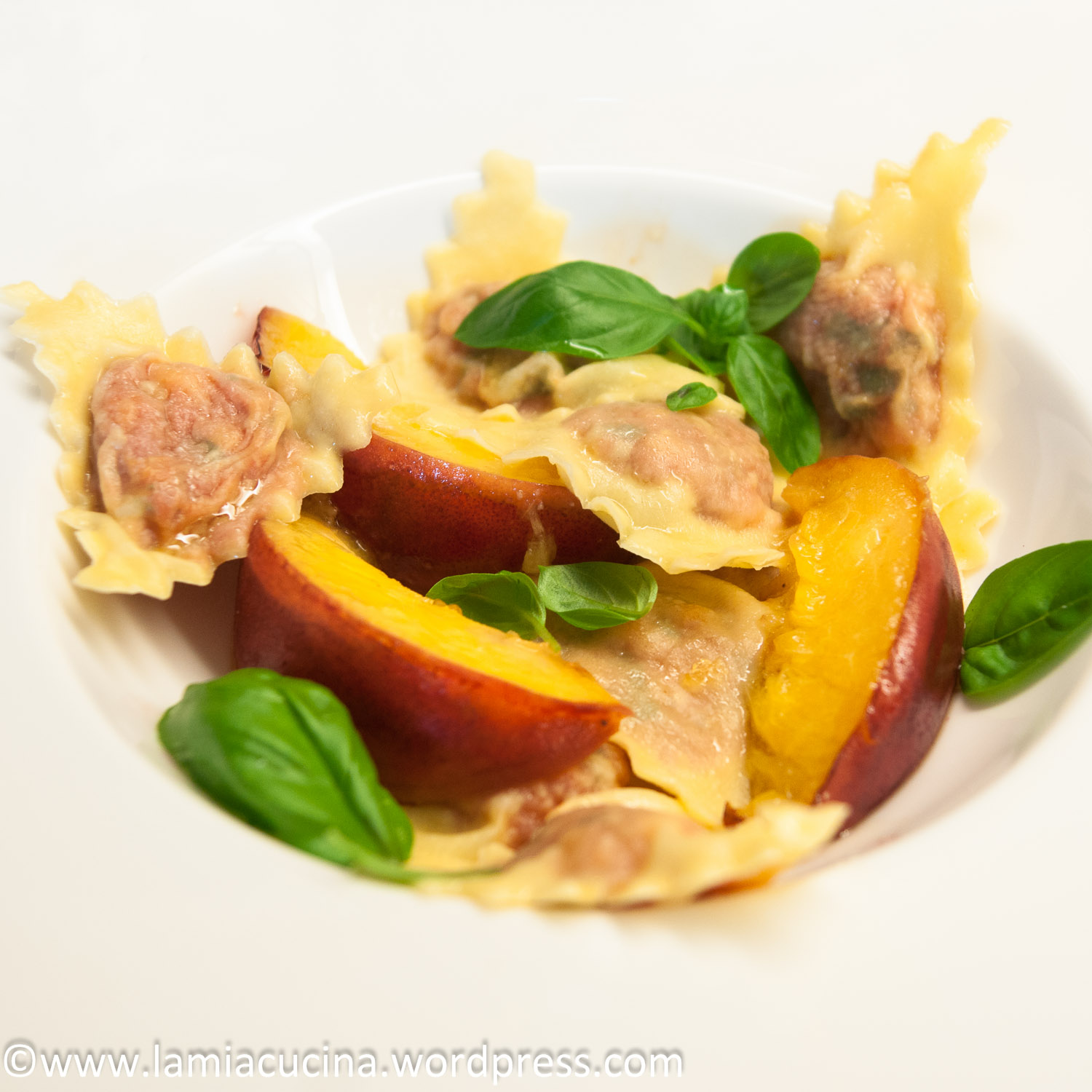 Ravioli in heissem, aber nicht siedendem Salzwasser gar kochen, 2-3 Minuten. Mit der Siebkelle abschöpfen und zu den Pfirsichen geben, in vorgewärmten Tellern mit Basilikumblättern servieren.