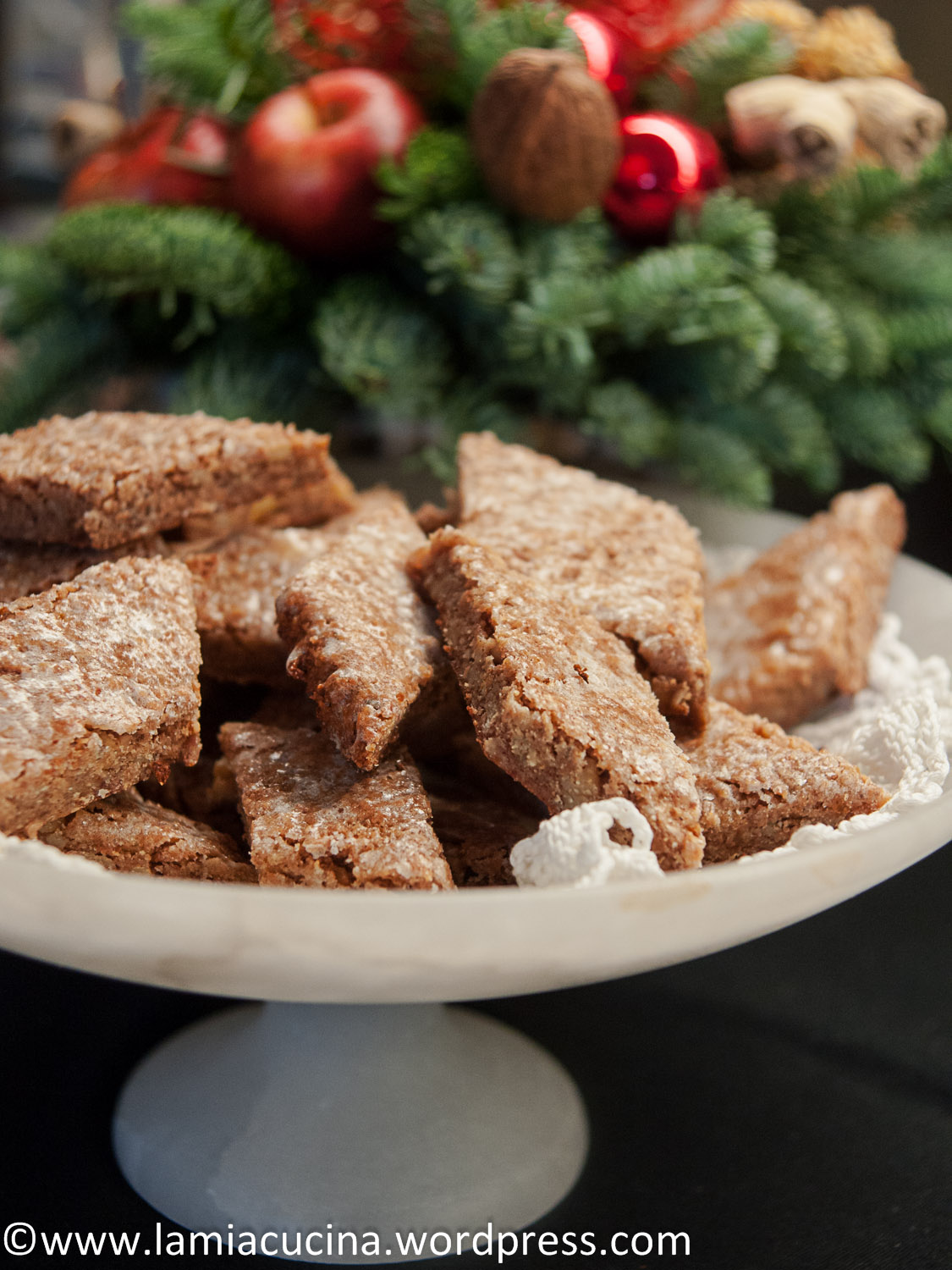 Ich hatte das Orangeat ein wenig zu grob gehackt. Beim zuschneiden der Rauten gabs daher etwas viel Brösel. Kommt davon, wenn man Guetzli bäckt ohne Frau L. Da die Leckerli nach 4 Tagen alle waren, hab ich sie ein zweites Mal gebacken. Nun mit geschärften Kanten.