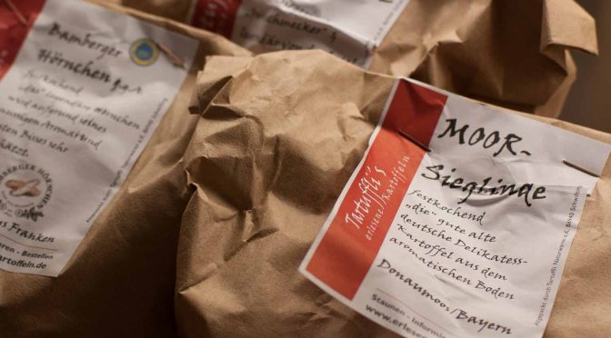Wollte mir direkt das Schwert ins Herz stossen, als ich gerade las, dass ich die putzigen Kartöffels im Hiebers übersehen hatte. Gottseidank scheint es aber nicht an meinen Augen gelegen zu haben. Trollte mich dann halt mit einem Sack Vitelotte noire und einer Knolle fermentiertem Knoblauch.