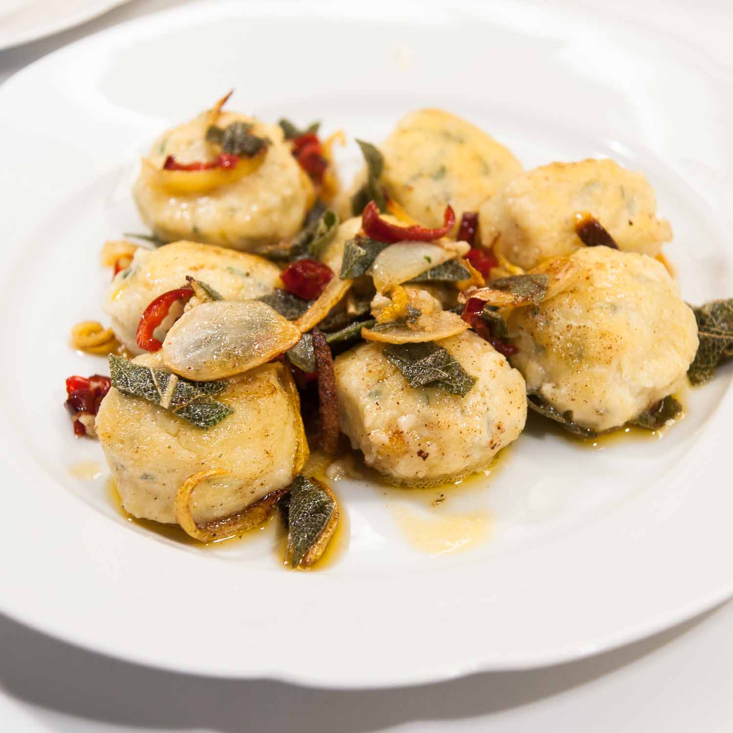 (8) Indessen in einer grossen Sauteuse Butter und Zitronenöl erhitzen, Zitronenzesten, Peperoncino, Knoblauch und Salbei in die schäumende Mischung geben bis der Knoblauch Farbe annimmt und die Zesten knusprig sind. Ein Elf. Zitronensaft zugeben, die Gnudi aus dem Salzwasser heben, abtropfen und max. 2 Minuten vorsichtig in der Sauteuse schwenken. Ggf. nachwürzen und mit etwas Parmesan servieren.