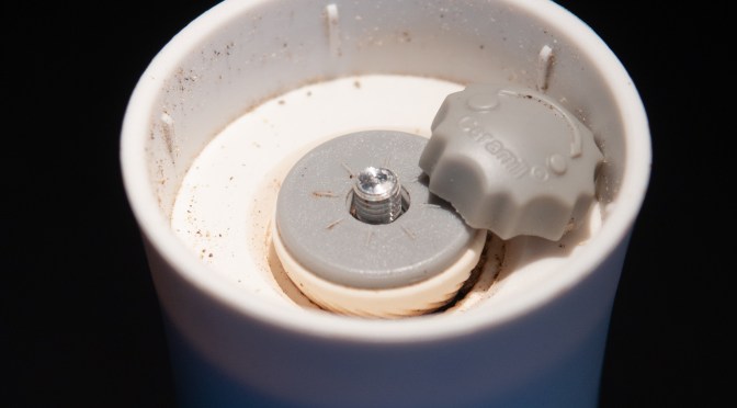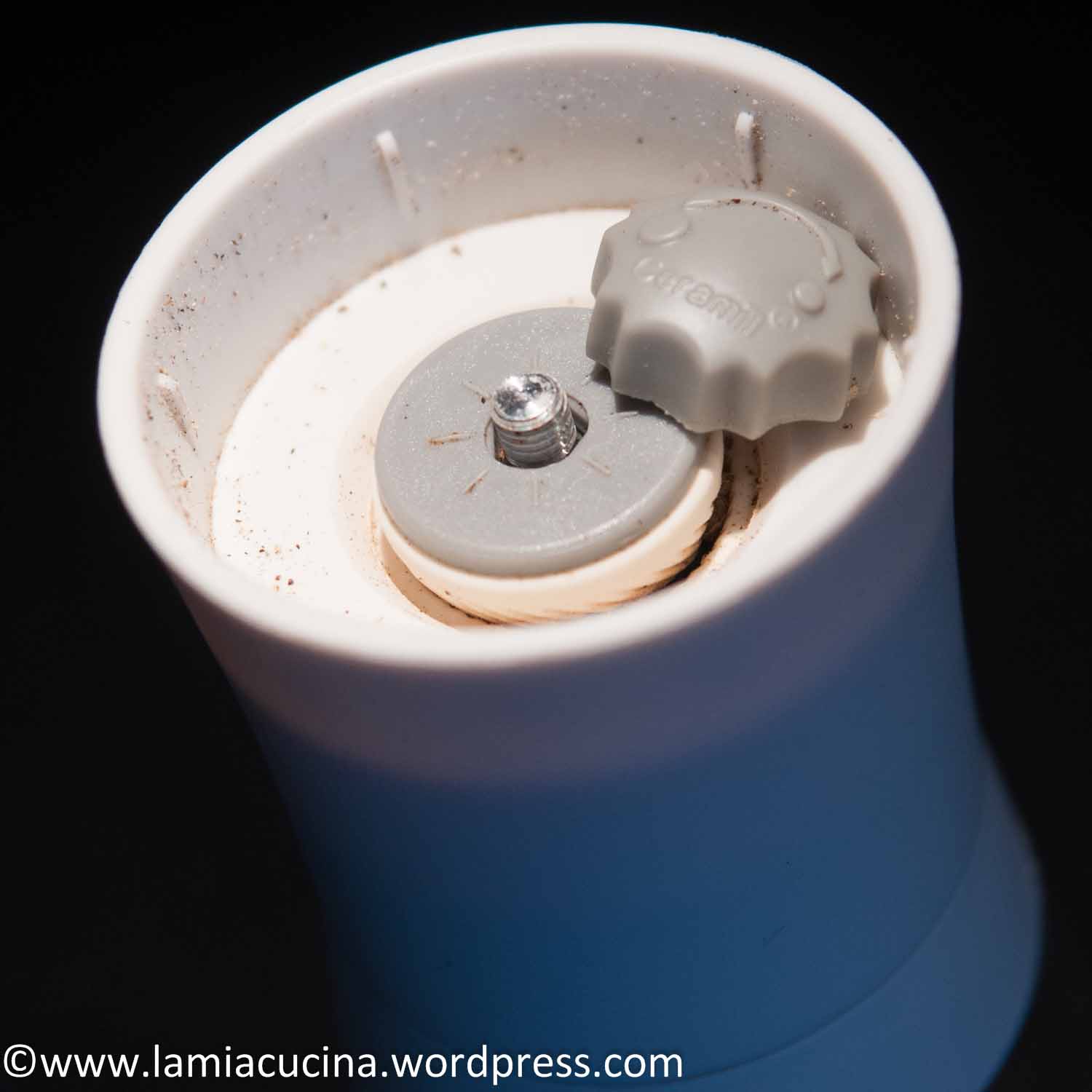 Das hat sich nun leider bestätigt. Die Keramik-Pfeffermühle der Württemberger Metallwarenfabrik hat ihre Regulierschraube nicht dort, wo sie bei klassischen Pfeffermühlen sitzt, nämlich oben, an einem Vierkantstahlstift, der durch das ganze Mahlgut reicht. sondern unten, da wo der gemahlene Pfeffer herausrieselt.