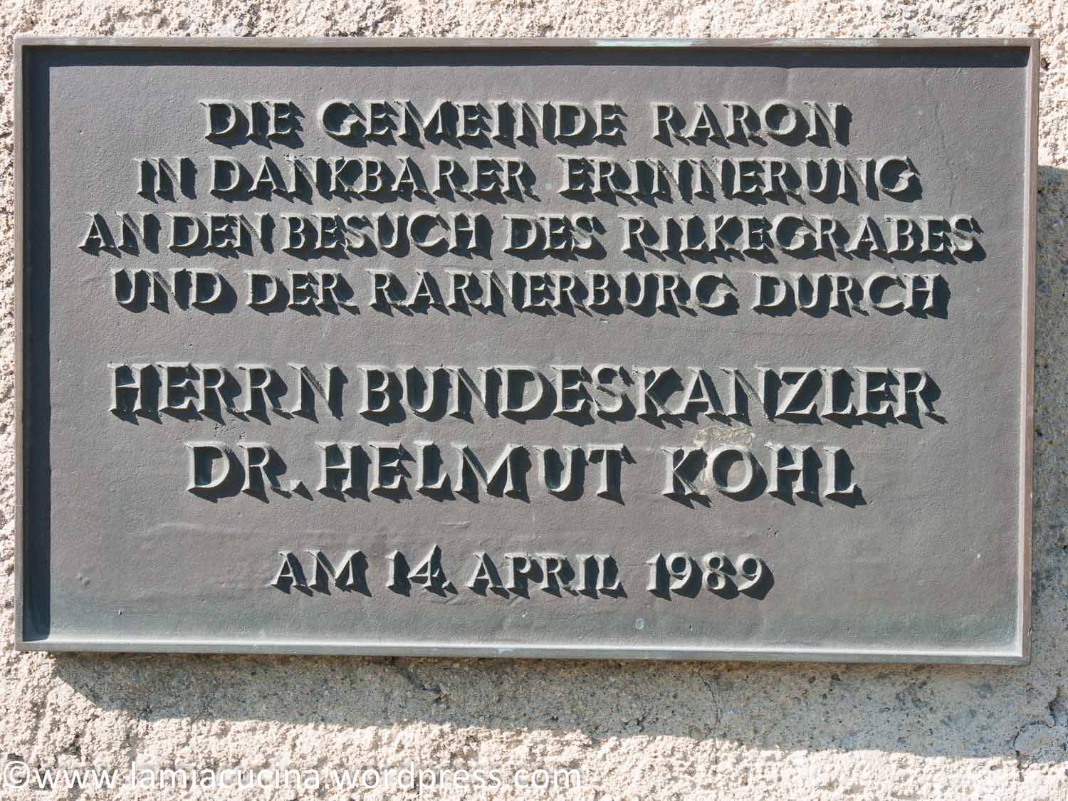 Da macht Raron keine Ausnahme. Dem gewichtigen Besucher entsprechend in Bronze gegossen, vom löblichen Gemeinderat in Auftrag gegeben und bezahlt: Der tiefe Dank an Herrn Bundeskanzler H. Kohl, dass er im April 1989 die Grabstätte R.M. Rilkes auf dem Burghügel besucht habe.