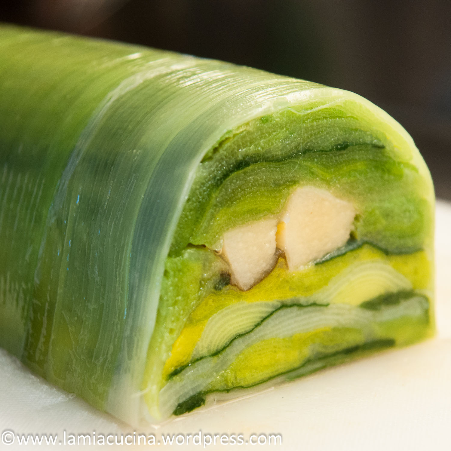 d) Die Terrine selbst schmeckt… vor allem nach Lauch… die Linsen-Quitten-Vinaigrette bringt Süsse und mehr Quittenaroma hinzu, ein Muss. Meine Terrinenform ist mit ihrem grossen Querschnitt nicht optimal. Eine schlankere Form wäre besser geeignet.