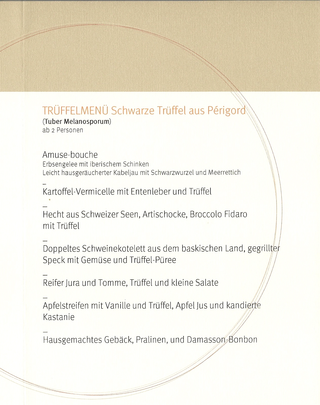 Eigentlich wollten wir von hier aus unseren alljährlichen Ausflug an den Genfersee machen. Malakoffs (Käsebeignets) essen. Wie jedes Jahr. Und endlich mal den Bericht über die Ölmühle in Sévery fertigstellen. Bei dem Dauernebel ein unsinniges Vorhaben. Wir blieben an der Wärme. Durch den Ausfall der ausserhäusig geplanten Mahlzeit fehlte mir jedoch eine Mittagsmahlzeit. Hungern? Mein Vorschlag, die mitgebrachte Schokolade zu teilen, mochte Frau L. nicht zu begeistern. So kamen wir zu einer Première: ein Mittagessen bei Georges Wenger im unweit gelegenen Le Noirmont (2 Michelinsterne, 18 GM). Es hätte ja nicht gerade das Trüffelmenu zu sein brauchen, aber wenn schon, dann richtig. Und wir habens nicht bereut. Die Welt mit ihren überflüssigen Erfindungen wie [siehe oben] Kreditkartenterminals ist zuweilen ganz praktisch. Weil wir die Périgordtrüffel brav aufgegessen hatten, schien am vierten Tag die Sonne.