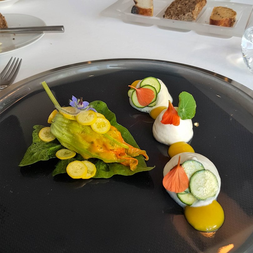 menu-a-sgier-20160901_131326 September 12, 2016 1500 × 1500 Bulzani mit Sugo oder Zwegschtenkompott Jakobsmuscheln in Zucchiniblüte, Caipirinhaschaum, Mangosauce