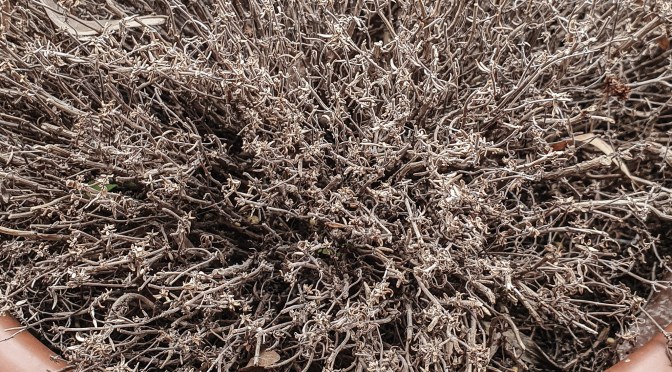 Heute habe ich im Kalender goldene Hochzeit vermerkt. Frau L. weiss nichts mehr davon, verschläft die Coronakrise und das ist gut so. Sie würde sich nur ängstigen. Ich koche heute Gemüsesuppe. Zum Dessert Gariguettes mit Limoncello. Als Blumenstrauss muss der letztjährige, vertrocknete Thymian vom Fensterbrett herhalten. Nur nicht unterkriegen lassen. Tutto andrà bene.