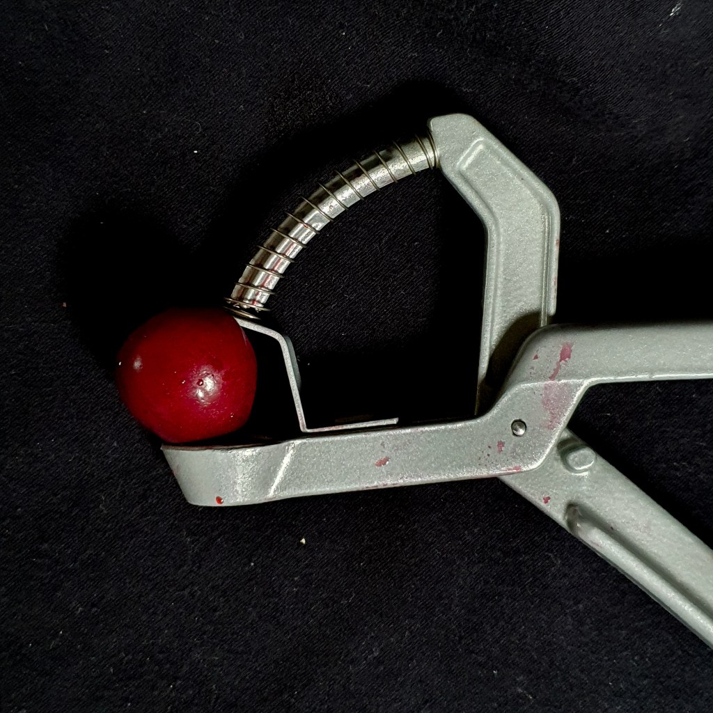 Mein altgedienter Kirschkernentsteiner entsteint nicht mehr. Er schrumpft. Jahr für Jahr wird er um mindestens einen Millimeter kleiner. Ähnlich dem Universum, das ja auch schrumpfen soll. Kirschen passen nicht mehr in die Entsteinerzange. Gelingt es trotzdem eine hineinzuquetschen, bleibt der Kern in der Auswurföffnung hängen, verkantet sich und kann nur noch mit brachialer Gewalt daraus entfernt werden. Untauglich.