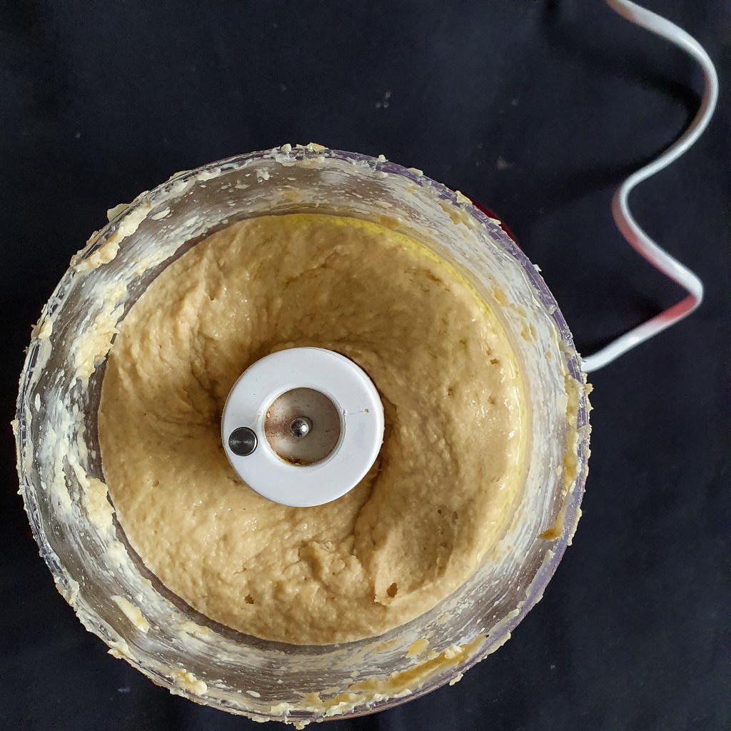 (4) Wurzeln in einen Cutter geben (L.: Moulinette), Knoblauchzehen aus den Schalen drücken und mit der Crème fraîche zu einem feinen Püree cuttern. Ist die Paste zu fest, etwas Rahm untercuttern. Abschmecken mit Salz, Pfeffer und dem Sherry-Essig, oder Zitronensaft.