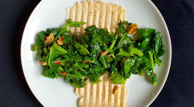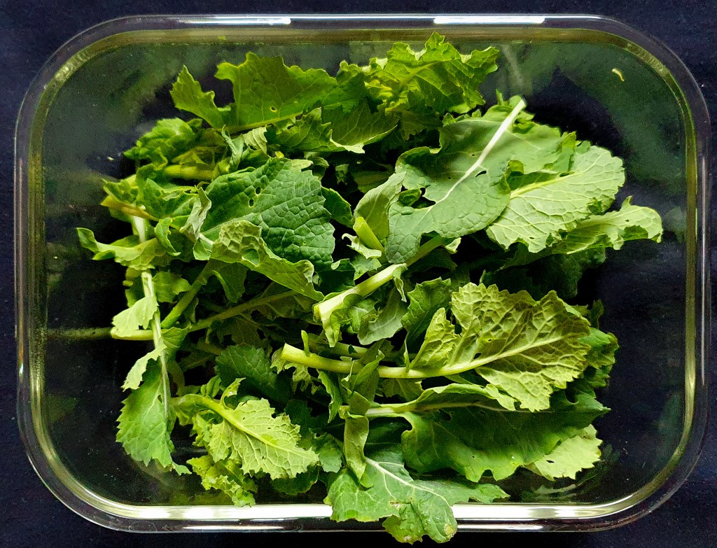 Kohlrabi-oder Brokkoliblätter, Stilmus… alles was brassica-mäßig daherkommt kann in Frage kommen.