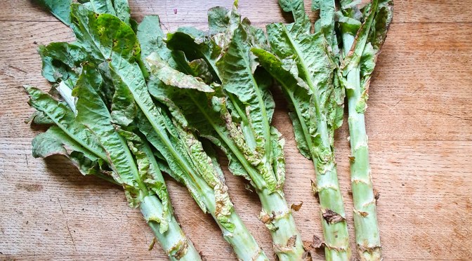 Die Biogemüsekooperative „La clef des champs“ im Jura, als deren Genossenschafterin Frau H. jede Woche ein Gemüsepaket bezieht, überraschte uns (vor allem mich) letzte Woche mit einem kuriosen Gemüse: Spargelsalat. Wer gerne googelt, darf ruhig mal danach suchen. Seitenweise Salat aus Spargel, doch kein Spargelsalat. Der Spargelsalat, den ich meine, findet sich erst nach beharrlicher Suche in den Tiefen der Suchmaschine. Im deutschsprachigen Raum kennt man ihn auch unter den Namen Gartenlattich, oder weniger elegant als Chinakeule. Französisch: laitue asperge, englisch: celtuce, celery lettuce oder stem lettuce (Lactuca sativa var. asparagina, L. angustana).