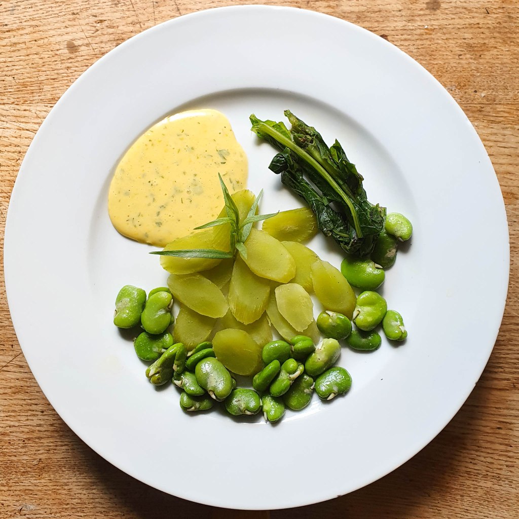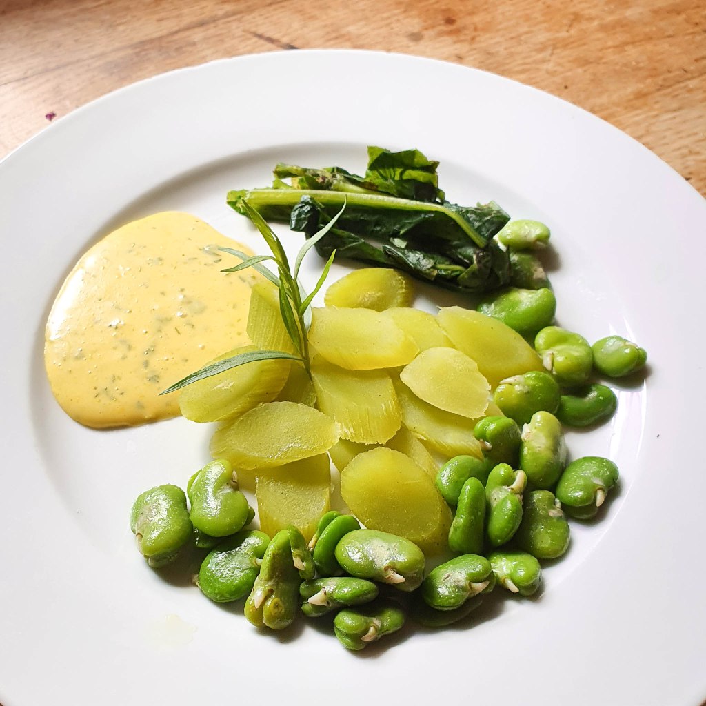 Weil die 5 gelieferten Lattichstangen nicht gerade hungerstillend aussahen, ergänzten wir den Teller mit den im selben Gemüsepaket mitgelieferten Ackerbohnen.