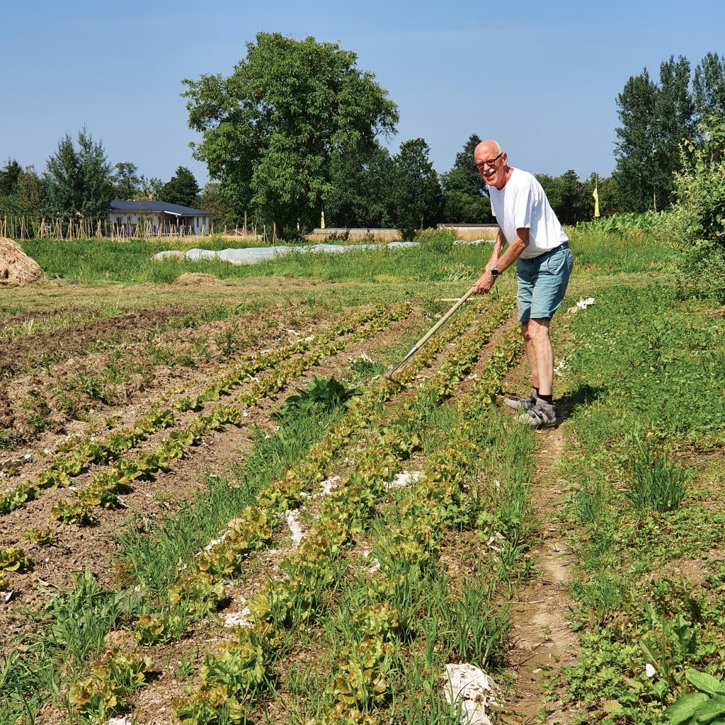 Apropos Bauer: die Biogemüse-Genossenschaft verpflichtet ihre Mitglieder jährlich zu ein paar Stunden Frondienst im Acker, abhängig von der Grösse der bezogenen Gemüsepakete. Gemeinsam mit Frau H. befreiten wir 120 Laufmeter Kopfsalatbeete von Unkraut. Die Arbeit mit der Pendelhacke war ungewohnt, das sieht man leicht an meiner hüftsteifen Haltung. Doch jäte ich gerne, weil man den Erfolg der Arbeit sofort sieht (nach Albert Einstein).