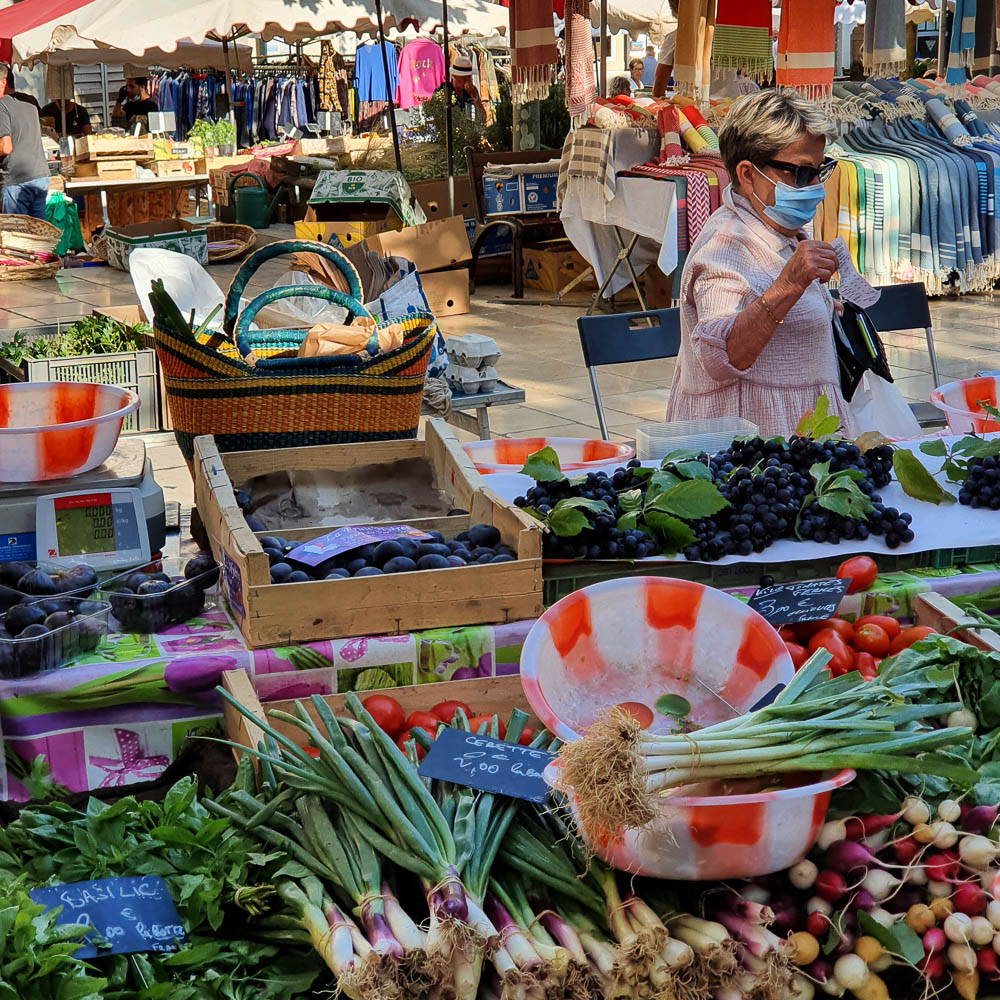 Ausflug nach Cassis und Wanderung im Nationalpark Calanques. Die Calanques sind fjordähnliche Buchten im Kalkgestein des Mittelmeers. Sie sind seit 2012 in einem Nationalpark geschützt und liegen rund 20 Kilometer entlang der Küste zwischen Marseille und Cassis. Im kleinen Fischerstädtchen Cassis besuchten wir den Markt. Etwa zwei Dutzend Stände, am Hafen bieten Fischer täglich ihren Fang an. Eine Augenfreude.