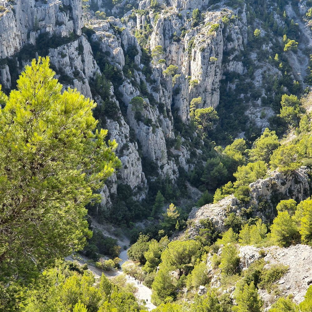 Nach der Mittagsrast gings den Berg steil hoch, mit vielen Zwischenhalten. Zeit für botanische Betrachtungen und Erläuterungen der Eigenheiten der Flora in den Calanques. Inmitten der Macchia u.a. Aleppoföhren, Strandföhren, Stech-Wacholder, Phönizischer Wacholder, stacheliger Dornginster, kleinblütiger Stechginster, Mastix-strauch, Terebinthe, Kermeseichen und echter Thymian. Da wir dafür zuviel Zeit benötigten, blieb uns nur noch der Blick hinab in die Schönste der Calanques, die Calanque d’En-Vau. Der Abstieg in die tiefe Schlucht hätte zu lange gedauert.