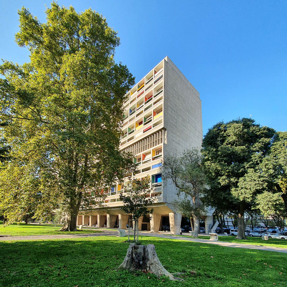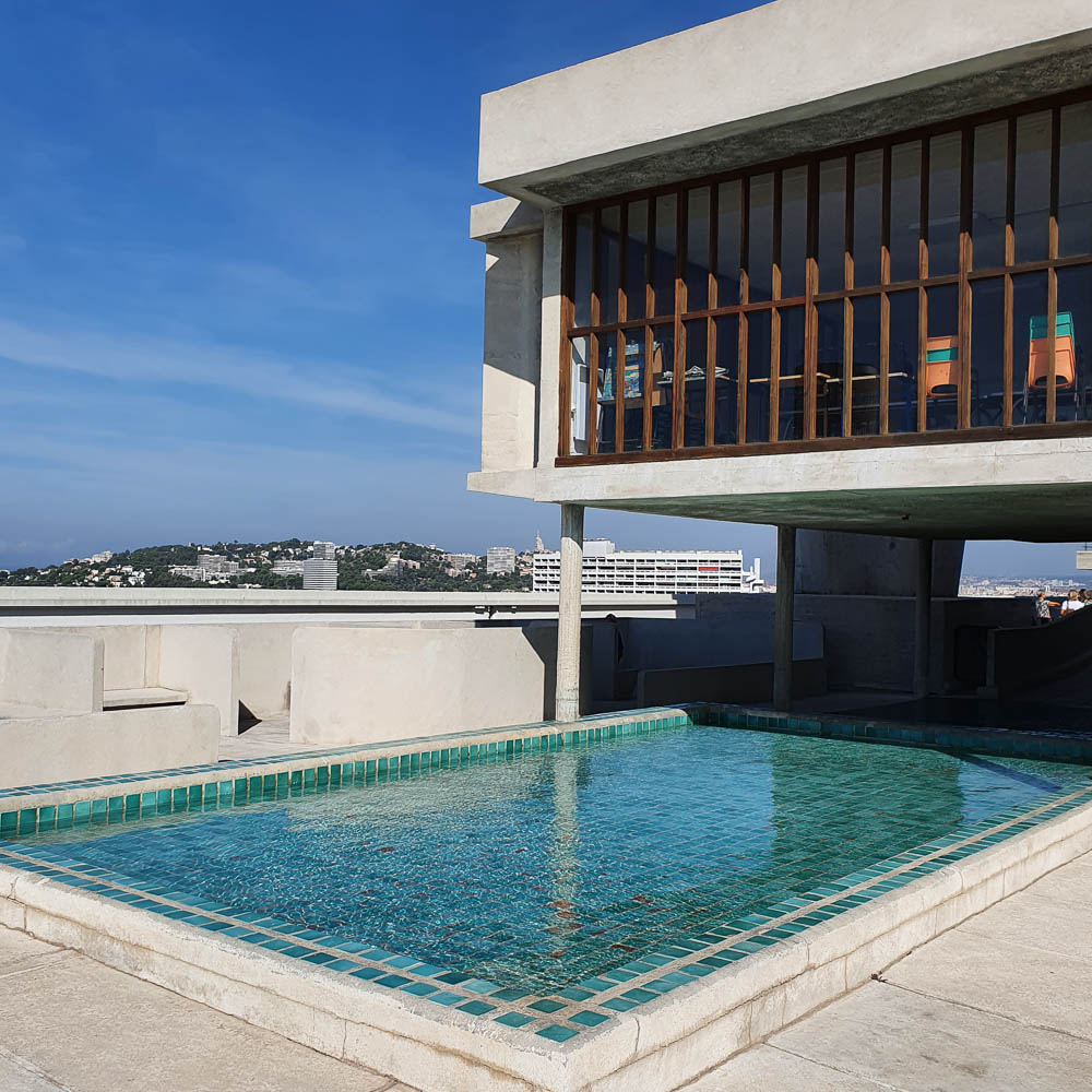 Mit standardisierter, modularer Serienproduktion (ein Vorgänger der Plattenbauten) wollte er den Bewohnern einen erhöhten Wohnkomfort zu erschwinglichen Preisen anbieten. Seine Idee wurde in Marseille mit der Cité radieuse 1947-1952 erstmals realisiert. In Frankreich entstanden weitere 3 Einheiten, eine in Berlin. Das Haus hat 337 doppelstöckige Appartements, Lift, Hotel, Wäscherei und ein Restaurant. Der Beton bröckelt, Armierungseisen liegen bloss. Die Aussicht ist schön, der Pool auf dem Dach war jedoch für die Bewohner reserviert.