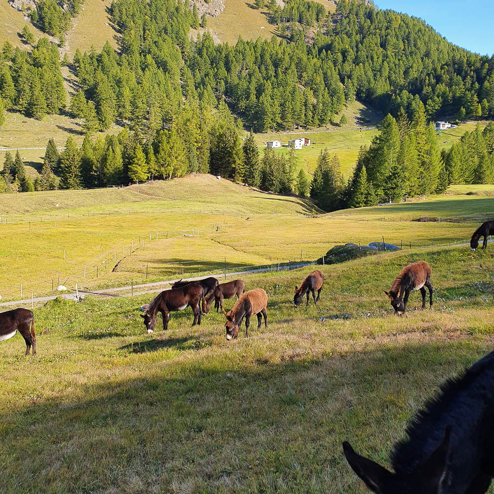 Friedliche Eselweide. Nur Fressen, nicht Laufen.
