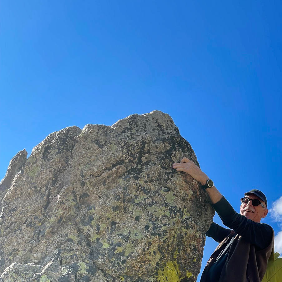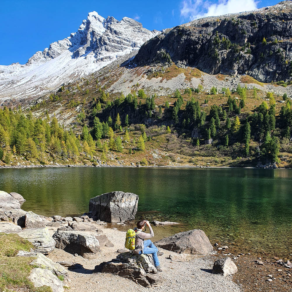 Lagh da Val Viola. 2160 m ü.M. Meine Begleiterin gönnt sich den Blick auf die Alpen durch den Feldstecher.