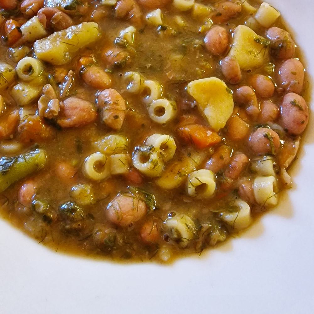 Mittagessen in der Cooperativa: Schöner Antipastoteller und nahrhafte Pasta (Ditali) mit Kartoffeln, Bohnenkernen, grünen Bohnen und Pancetta, gewürzt mit Fenchel, gekocht von Frauen des Dorfes. Wasser und der allgegenwärtige (gute) Rotwein aus Plastikflaschen.