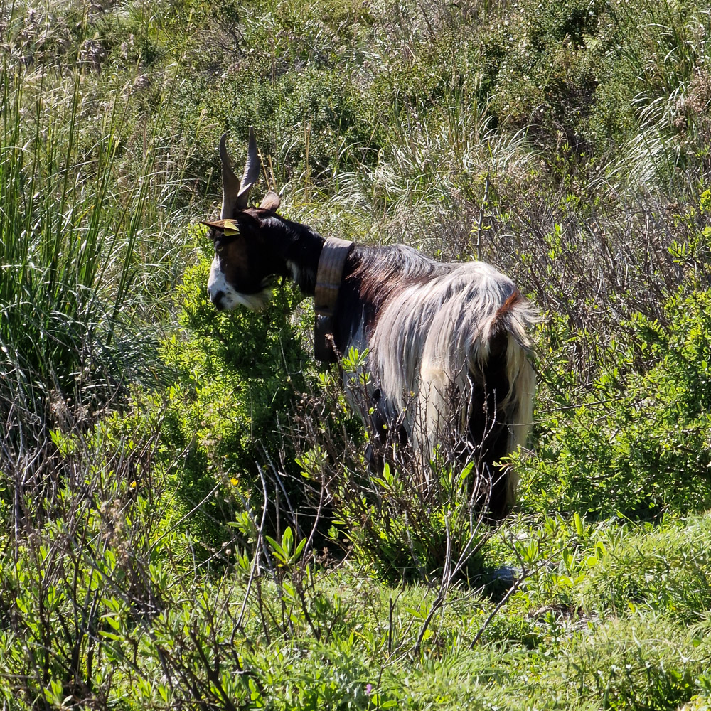 Abstieg durch die blumenreichen Weiden des Aspromonte. Die kalabresischen, krummhörnigen Ziegen waren leider eher dem Fressen als den Touristen zugewandt.
