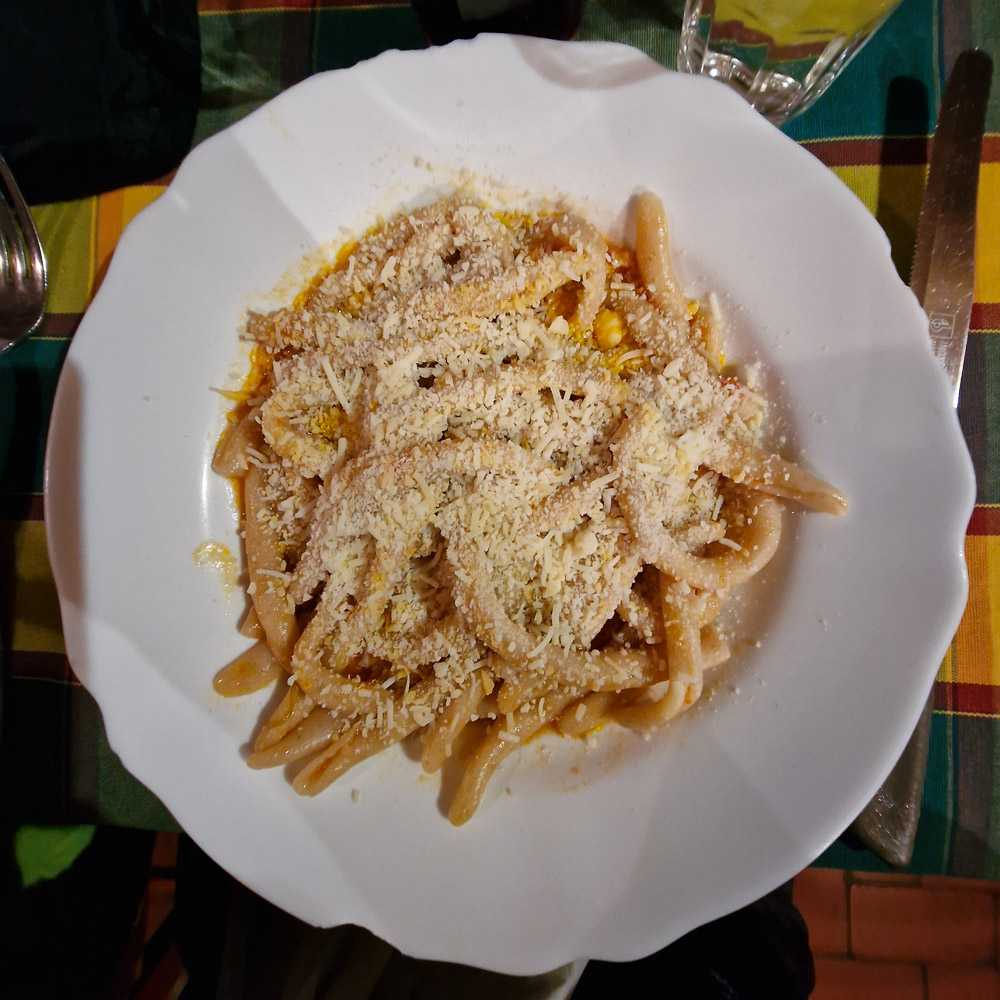 Nachtessen in der Azienda: Als Primo frische, hausgemachte Fileja calabrese mit Ceci, Tomatensauce und Ziegenschmorsud. Bestreut mit geriebener Ziegenricotta salata. Hauptgang: (Unmengen) von zart geschmortem Ziegenfleisch.