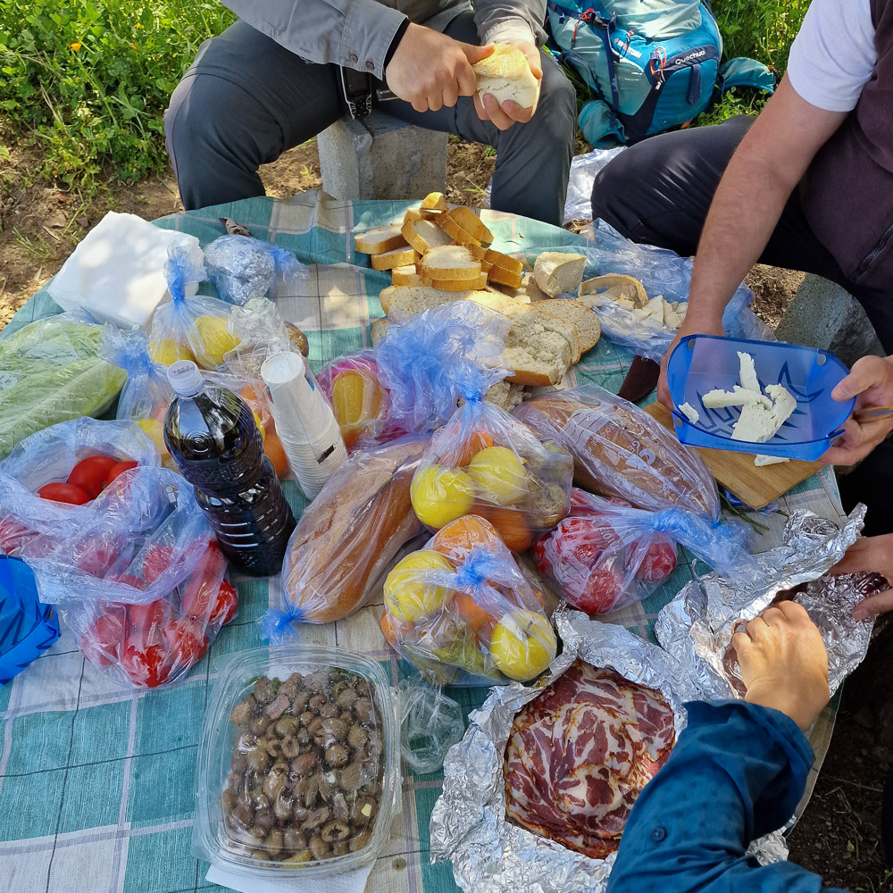 Bis zum verdienten Mittagessen, dem Picknick im Garten von Francesco. Die Ragazzi richten das von uns mitgetragene Essen her. Den Wein trug ich.