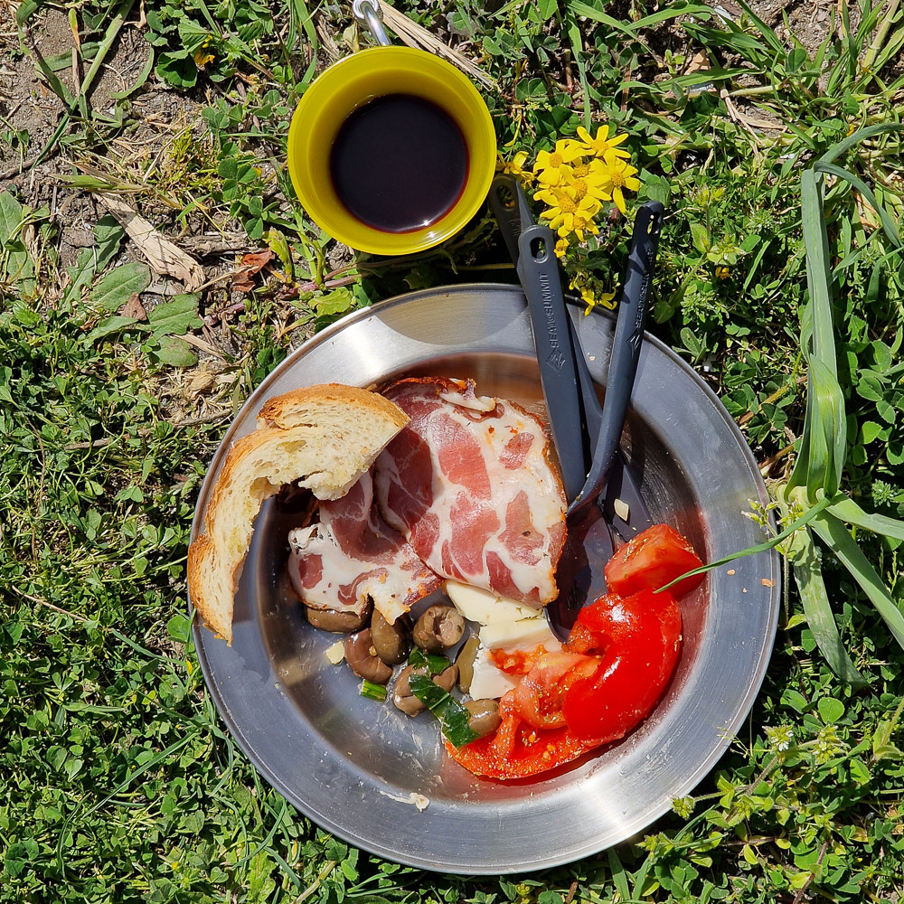 Ein Tellerbild nach Art von Barbara Spielwiese. Allerdings auf Blech und in Plastik. Vorzüglicher Capocollo, Ziegenkäse, Oliven und Tomaten.