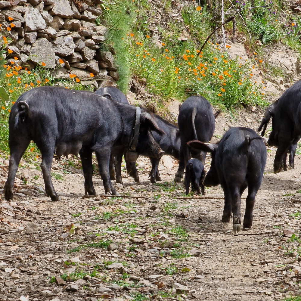 Frisch gestärkt wieder Berg hoch. So ist das hier, wo immer man hin will, immer geht es wieder hoch, zwischendurch eine nette Begegnung mit der frei herumlaufenden autochtonen Schweinerasse „Nero di Calabria“ bis zum Picknickplatz, diesmal in der Remise eines Bauern. Denn inzwischen ist der Himmel überzogen und ein starker, kalter Wind bläst. Zum Picknick gibt es u.a. Fleisch vom Grillfeuer.
