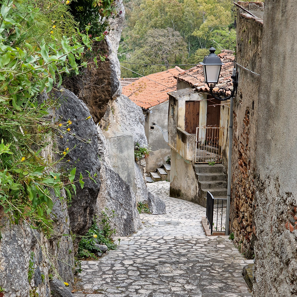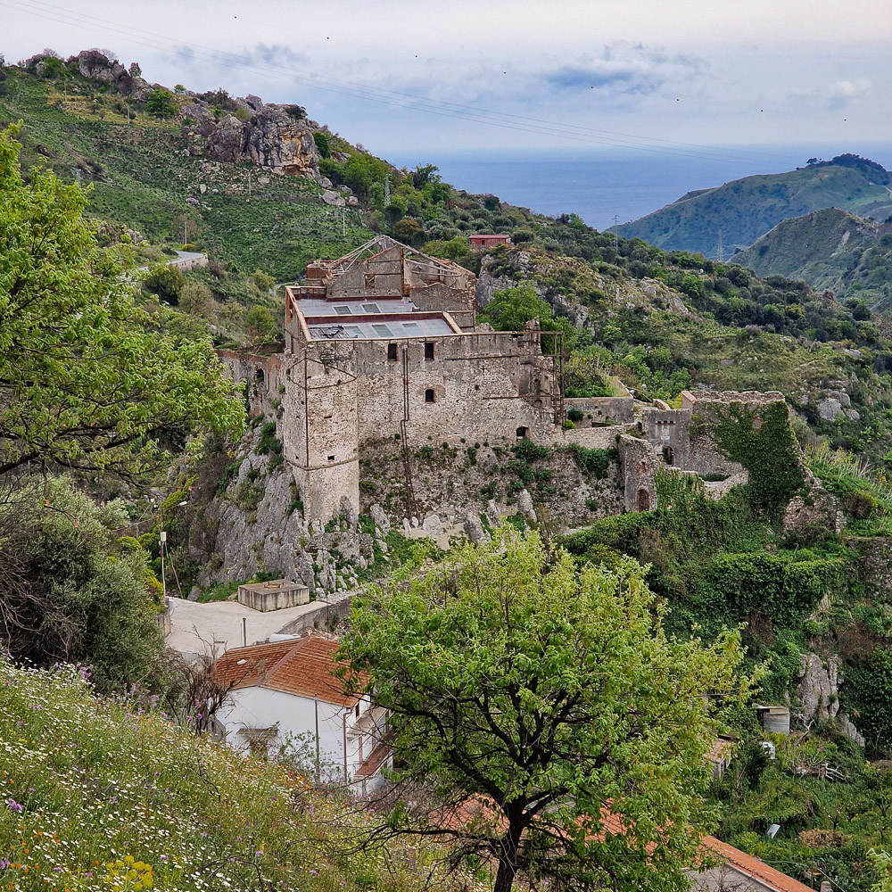 Danach am Monte Grappida vorbei nach Palizzi, von oben fällt der Blick auf das leere, baufällige Schloss.
