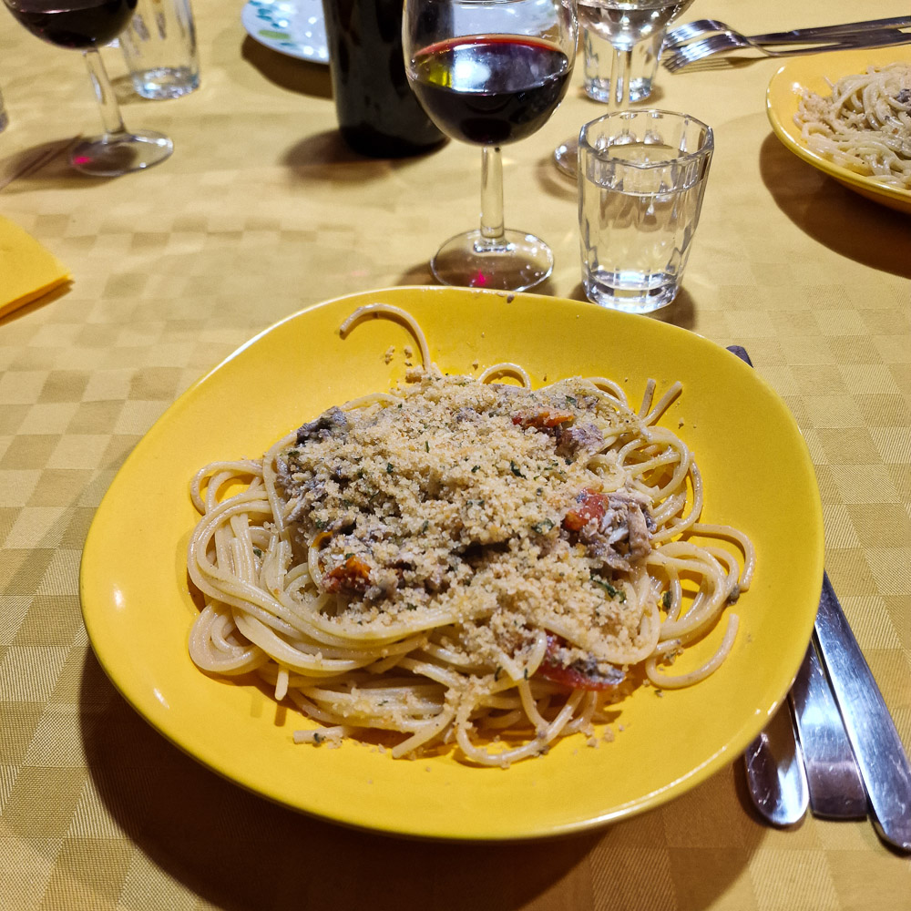 Als Nachtessen reichhaltige Antipasti. Danach Spaghetti con mollica e alici alla calabrese und Muscheln.