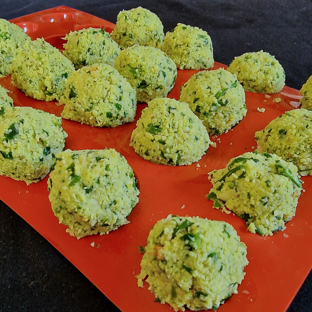 (2) Eingeweichte Kichererbsen abschütten und abtropfen lassen. Zwiebel und Knoblauch zugeben und in einem Cutter zerkleinern, dabei die am Rand haftende Masse (bei abgestelltem Motor) mit einem Schaber immer wieder manuell untermischen. Bei Bedarf wenig! Wasser zugeben. Am Schluss die Kräuter zugeben und mitcuttern.