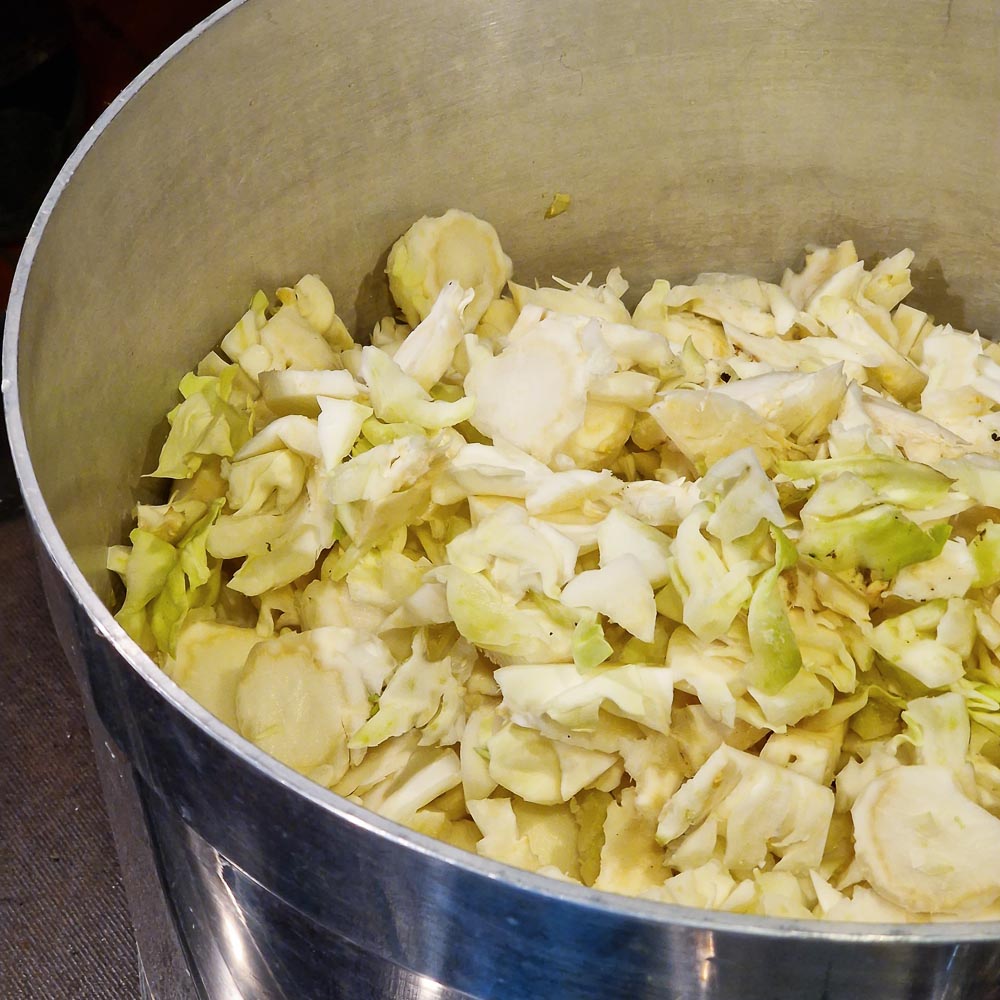 Unzählige Kohlstorzen (etwa 180) haben wir zwei ausgestochen, die schönsten werden zuhause zeitnah verarbeitet. Im 15 Liter Topf zu Püree gegart, teils eingefroren…