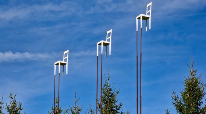 „Über den Wolken, muss die Freiheit grenzenlos sein“. Wer auf den Stühlen sitzt, darf sich ausruhen und auf die emsige Umwelt hinabschauen. Bei gutem Wetter sieht man vielleicht sogar das Meer. Doch wie kommt man da hinauf?