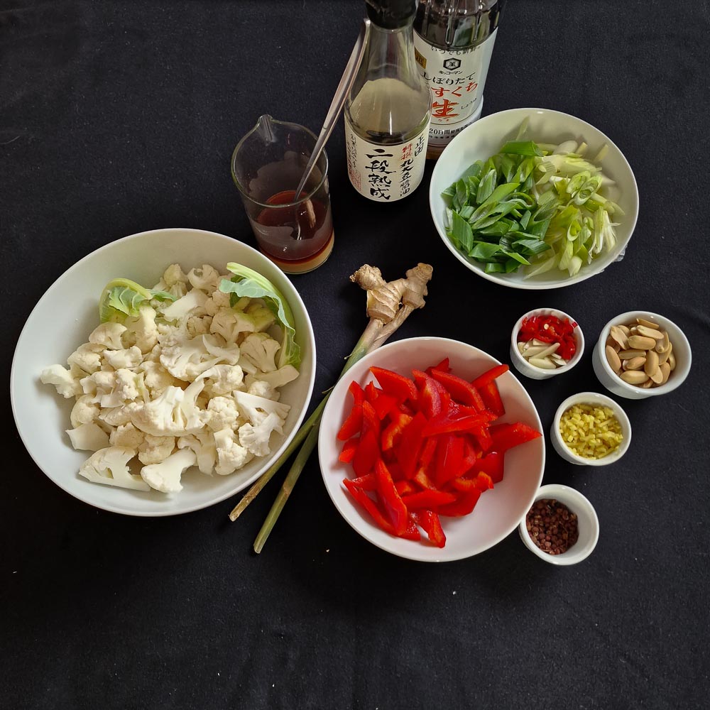 (7) Blumenkohl mit dem Bratöl während ca. 5 Minuten rührbraten, Bundzwiebelweiss und Knoblauch, Ingwer, Szechuanpfeffer und Chili unterrühren und weitere 2-3 Minuten rührbraten.