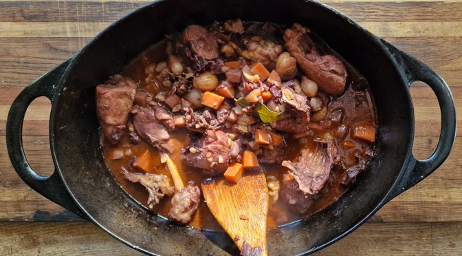 Ein Coq au Vin mit Huhn statt Hahn. Da die heutigen Rassen auf das Eierlegen hin gezüchtet wurden, stehen die Hähne dem modernen Rentabilitätsdenken im Wege und werden als Küken, kaum geschlüpft, wieder ins Vogelparadies zurück spediert. Wobei „spedieren“ eine reichlich euphemistische Umschreibung des tatsächlichen Geschehens ist.