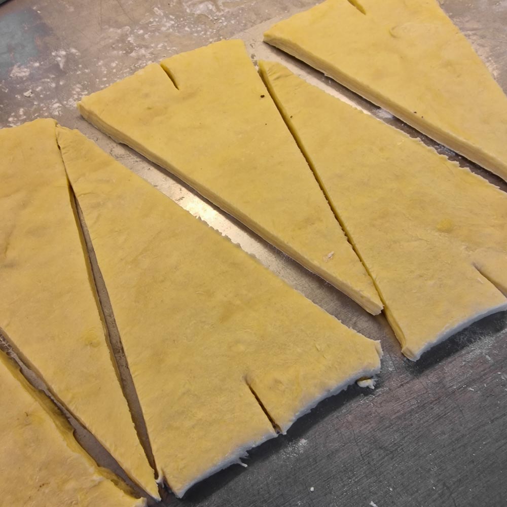 (10) Die Dreiecke so hinlegen, dass die Spitze nach hinten zeigt. An der kurzen Seite des Dreiecks jeweils 1.5 cm lang einschneiden. Leicht auseinander ziehen und mit beiden Händen zur Spitze hin aufrollen. Am Anfang mit leichtem Druck in die Breite stossend.