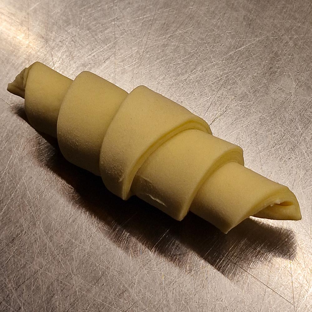 Der Teig muss gekühlt sein. Ist er zu warm -oder wird durch allzu langes Ausrollen warm, schmilzt die Butter in die Mehlschicht und es resultiert ein Briocheteig, dem die blättrige Struktur des Croissant fehlt. Das Ausrollen auf einer kühlen Arbeitsplatte ist deshalb von Vorteil. Bei sommerlichen Temperaturen muss sehr rasch gearbeitet werden.Der Teig soll gleichmässig dick ausgerollt sein. Dazu das Rollholz in der Mitte ansetzen und von sich wegrollen. Teigstück um 180° rotieren und das Ausrollen auf die andere Seite wiederholen. Zieht man das Rollholz gegen sich, wird meist weniger Druck ausgeübt und die Teigplatte wird uneben.