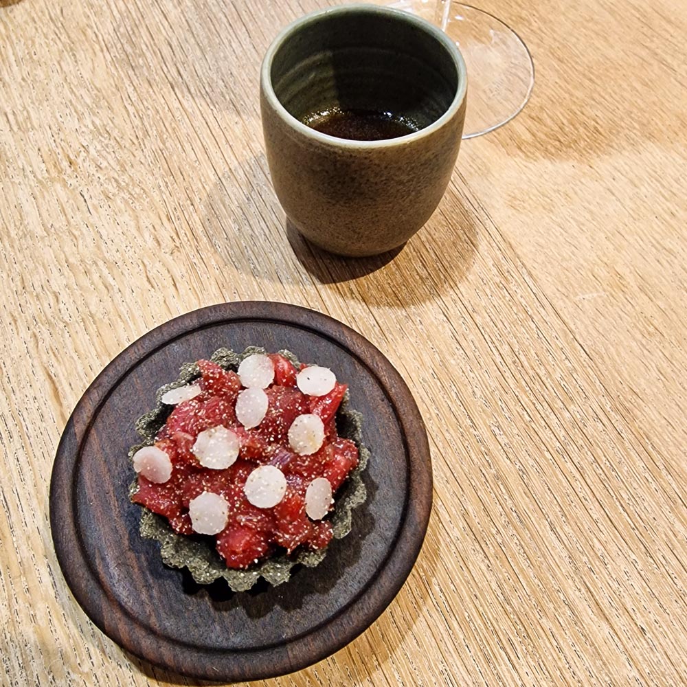 Boeuf / Topinambour / Foin: Törtchen gefüllt mit Rindertartar und Topinambour. Dazu eine Rinderessenz.