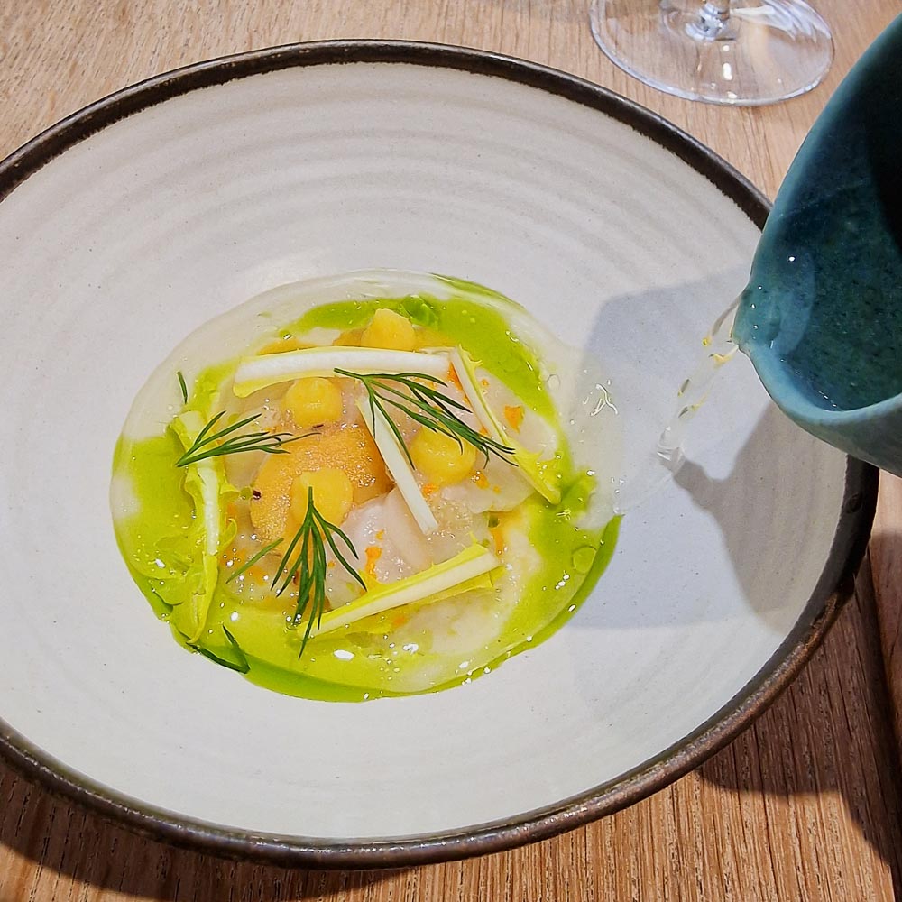 Saint Jacques / Oca du Pérou: Scheiben von rohen Jakobsmuscheln mit Oca (Oxalis tuberosa), Löwenzahn, Schnittlauchöl und einer aromatischen Dashi.