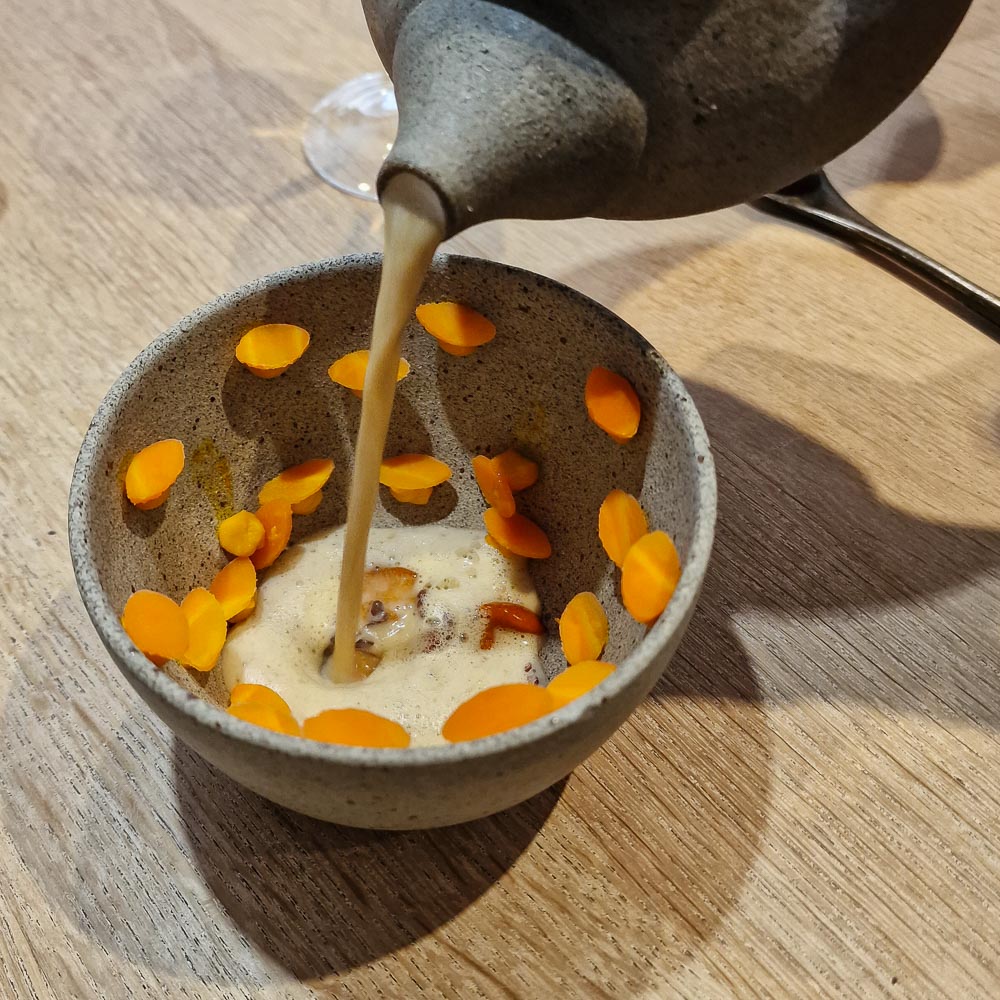 Oursin / Carotte / Tonka: Seeigelfleisch mit Karotten und einer Seeigel-Bisque.