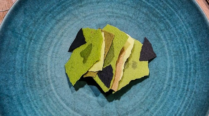 Camouflage: Truite / Genièvre / Persil: Der signature dish von AT: mit Wacholder leicht geräuchte Forelle, versteckt unter dünnen, verschieden grünen Chips, bestreut mit gefrorener Granita aus mit Wacholder geräuchtem Fromage blanc, beträufelt mit Petersilienöl.