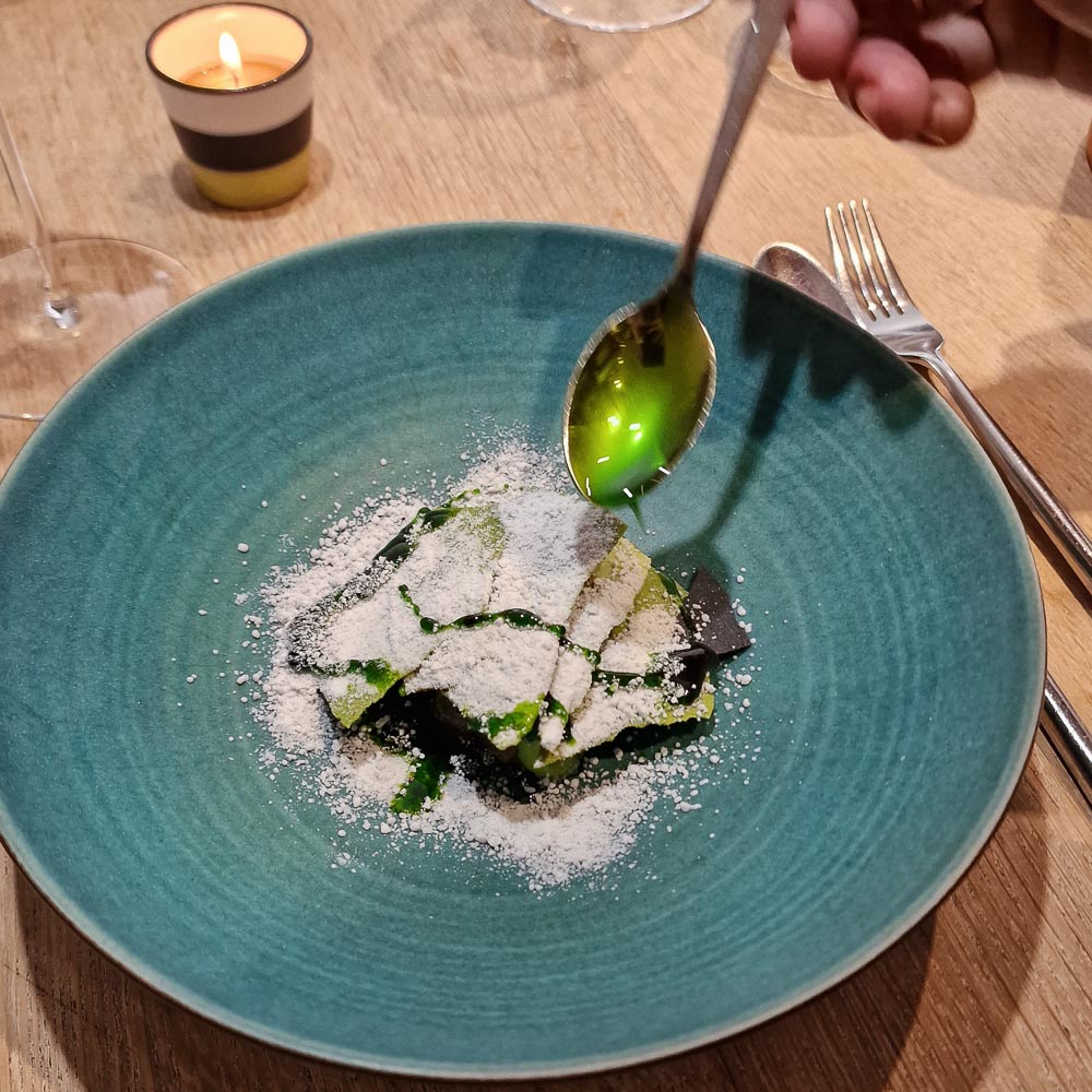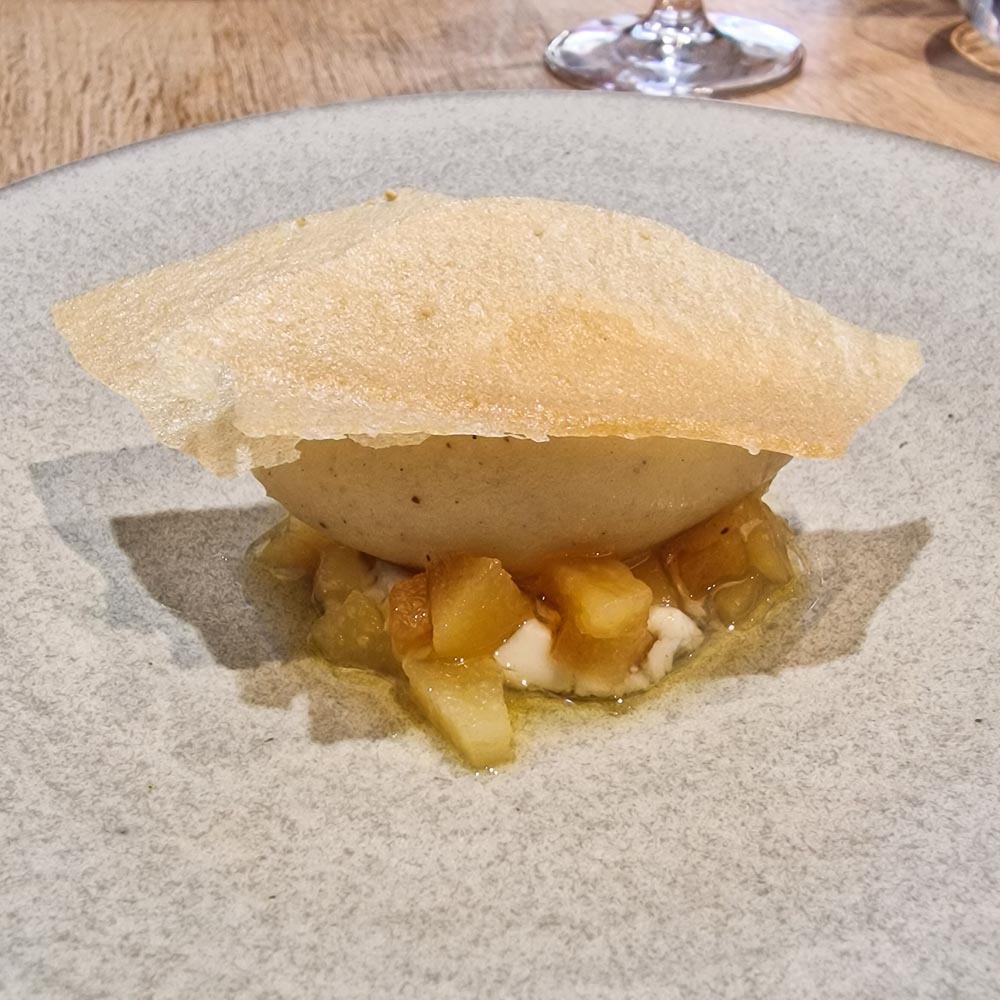 Pigeon de Poitou / Rutabaga / Sudachi Kosho: Gebratene Taubenbrust und -jus. Üppige Fleischportion. Von den kleinen Beilagen erinnere ich mich nur noch an das Tannennadelpesto, Stachys, Rutabaga und das Gewürz aus japanischen Zitronen. Das in Sesam gebackene Taubenbein inklusive Krallen erinnerte an einen Flugsaurier und war deplaziert.