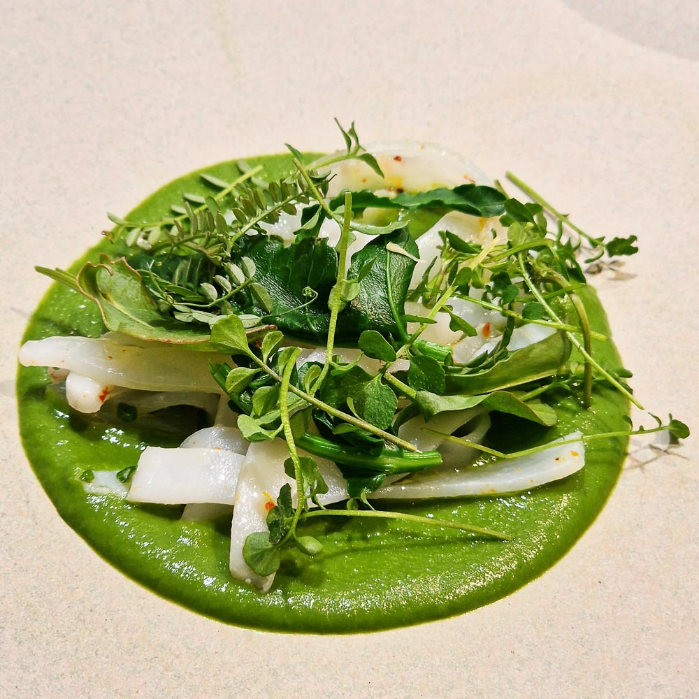 Encornet / Cima di Rapa / Cédrat: Tintenfischstreifen auf Cima di Rapa-püree und Zedratzitronenwürfeln.