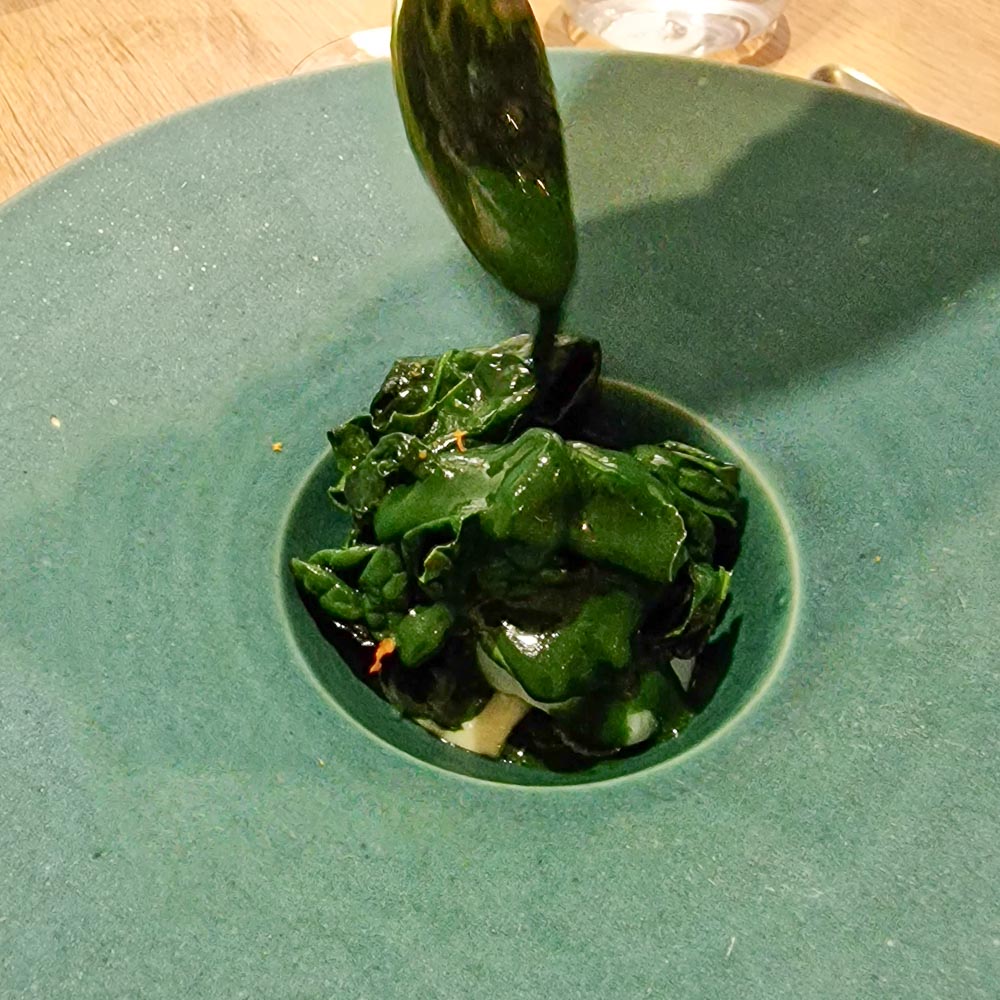 Turbot / Epinard / PilPil: Steinbutt an und in Spinat, mit Pil Pil und Salbeisauce gewürzt.