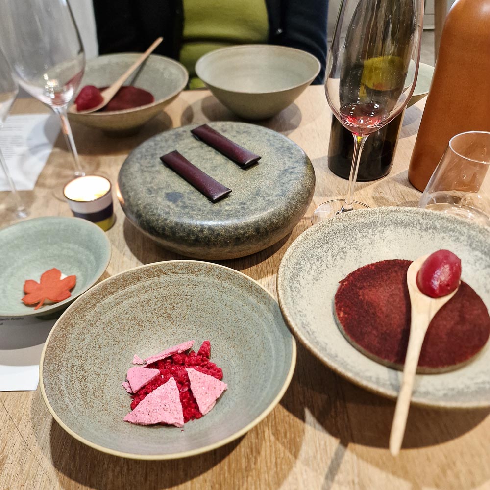 Pré-Dessert Betterave / Poivre de Timut : Rote Bete als Biskuitblatt, Gel-Stangen mit halbflüssiger Crème-Füllung, Randen-Eiweiss-Chips mit Randen-Granita und als Konfitüre.