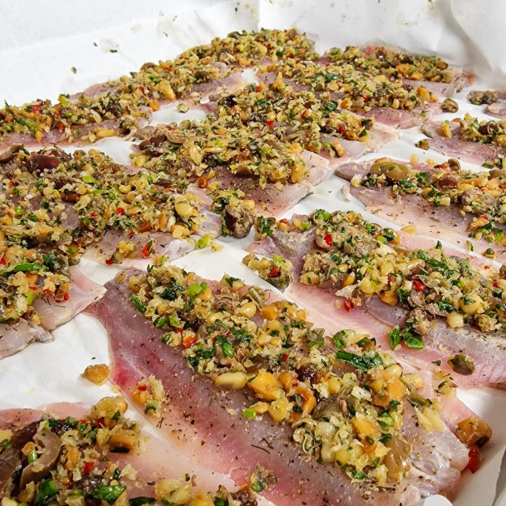 Zutaten für die Füllung mischen und abschmecken. Füllung auf die Filets verteilen, oberen Rand frei lassen.